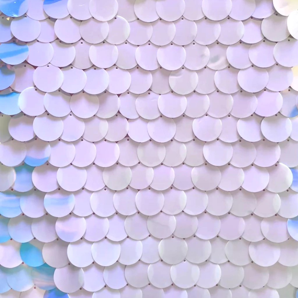 Tela de lentejuelas grandes y brillantes de 2,5 cm de diámetro, cosidas sobre base de microtul elastizado. Su efecto tornasol genera un acabado impactante, ideal para moda y decoración de eventos.