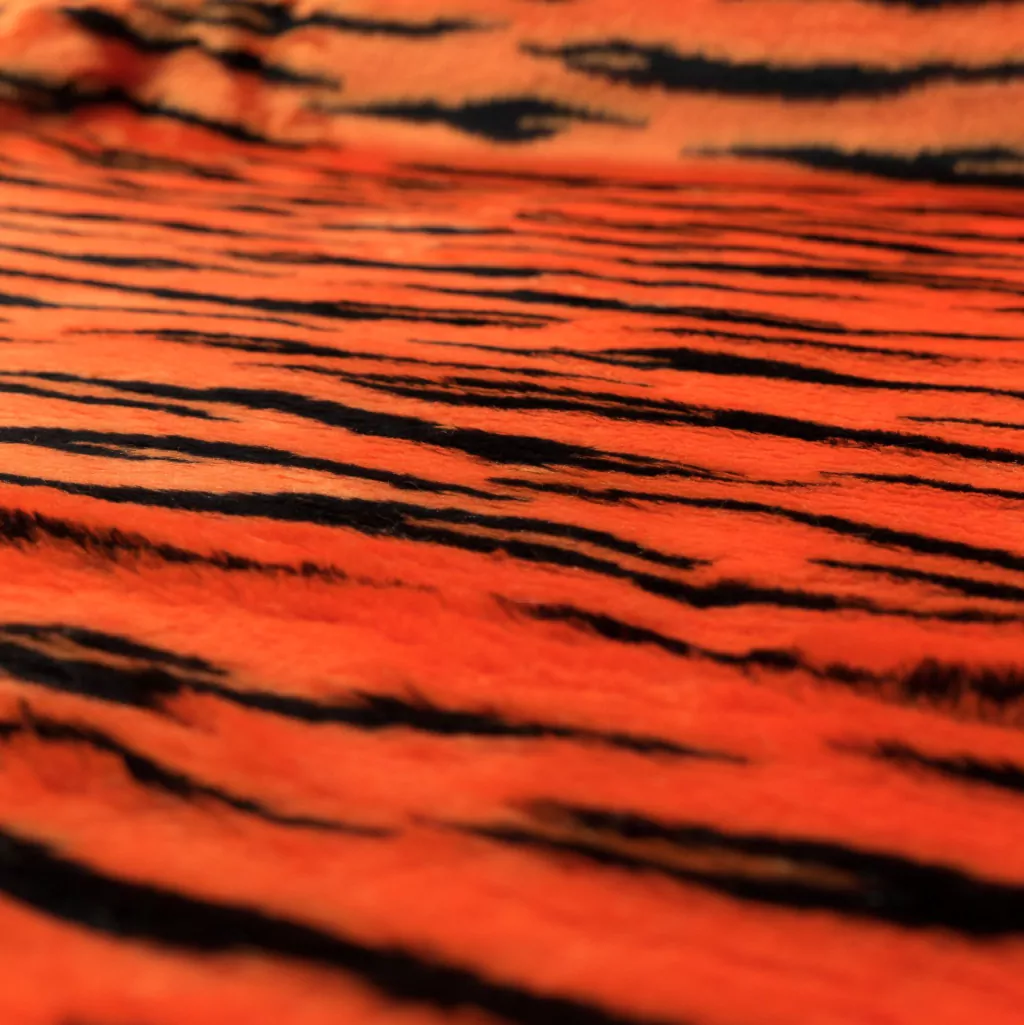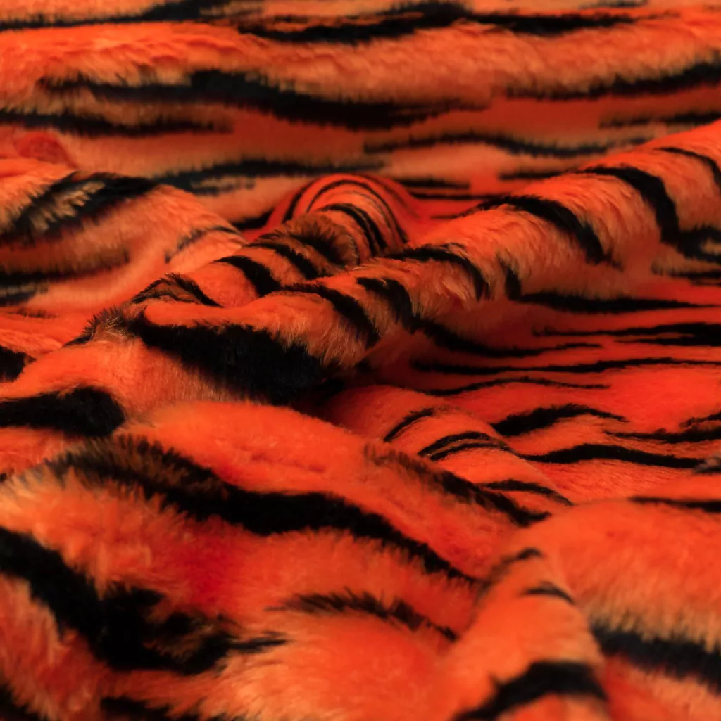 El peluche es una tela suave de pelo corto sintético. También cuenta con backing y es excelente conductor de calor, viene estampado de tigre con un excelente acabado que no pierde color.